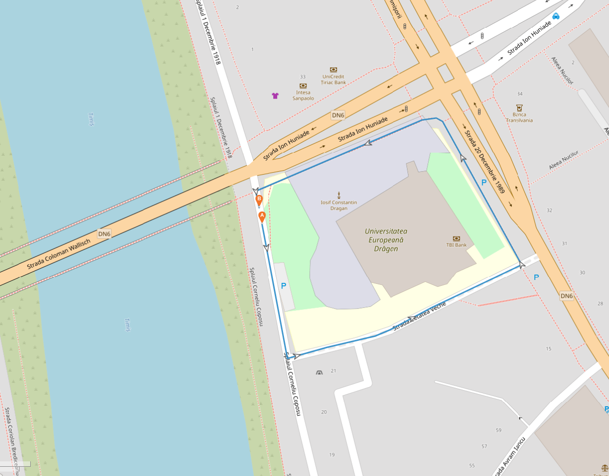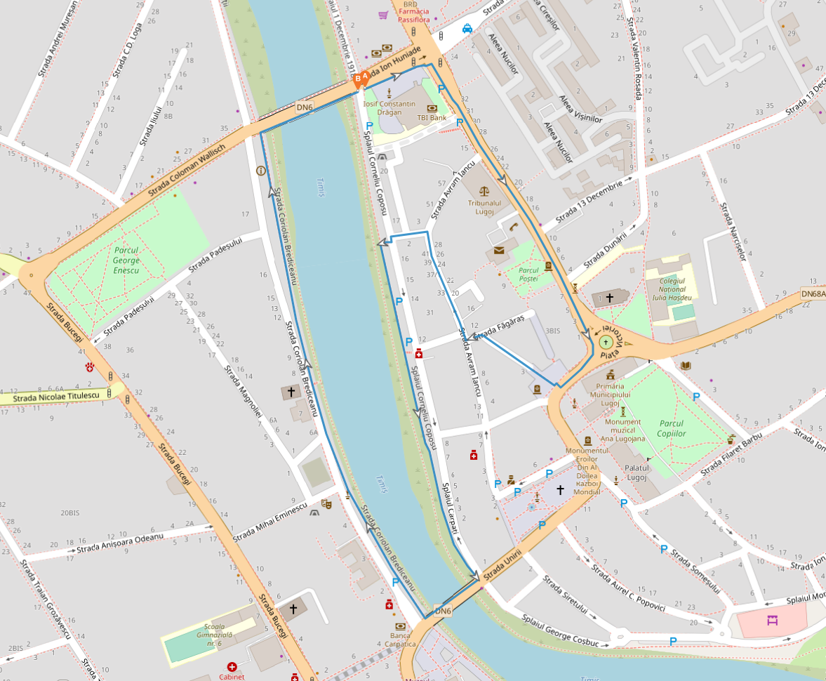 Univ. Europeană Drăgan – str. 20 Decembrie 1989 (sensul spre Primărie) – str. Andrei Șaguna – str. Eftimie Murgu – str. Făgăraș – str. Avram Iancu – Pasajul Avram Iancu – Splaiul Corneliu Coposu (trotuar) – Podul de Fier (trotuar) – str. Coriolan Brediceanu (trotuar) – Podul de Beton (trotuar) – Univ. Europeană Drăgan.