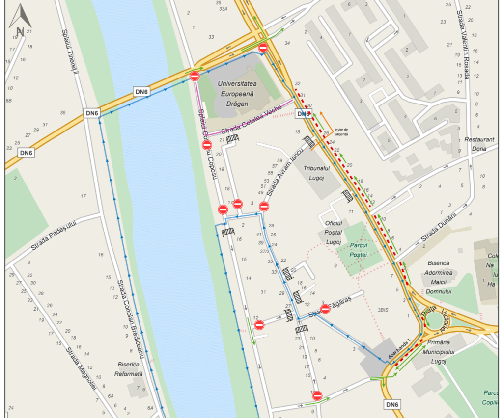 Pe Splaiul Corneliu Coposu, sectorul cuprins între str. Coloman Wallisch și str. Cetatea Veche – întreruperea circulației între orele 08:00 – 13:30. Conducătorii auto care vin de pe Podul de Beton și doresc să vireze la dreapta pe Splaiul Corneliu Coposu vor fi re-direcționați înainte pe str. Ion Huniade.